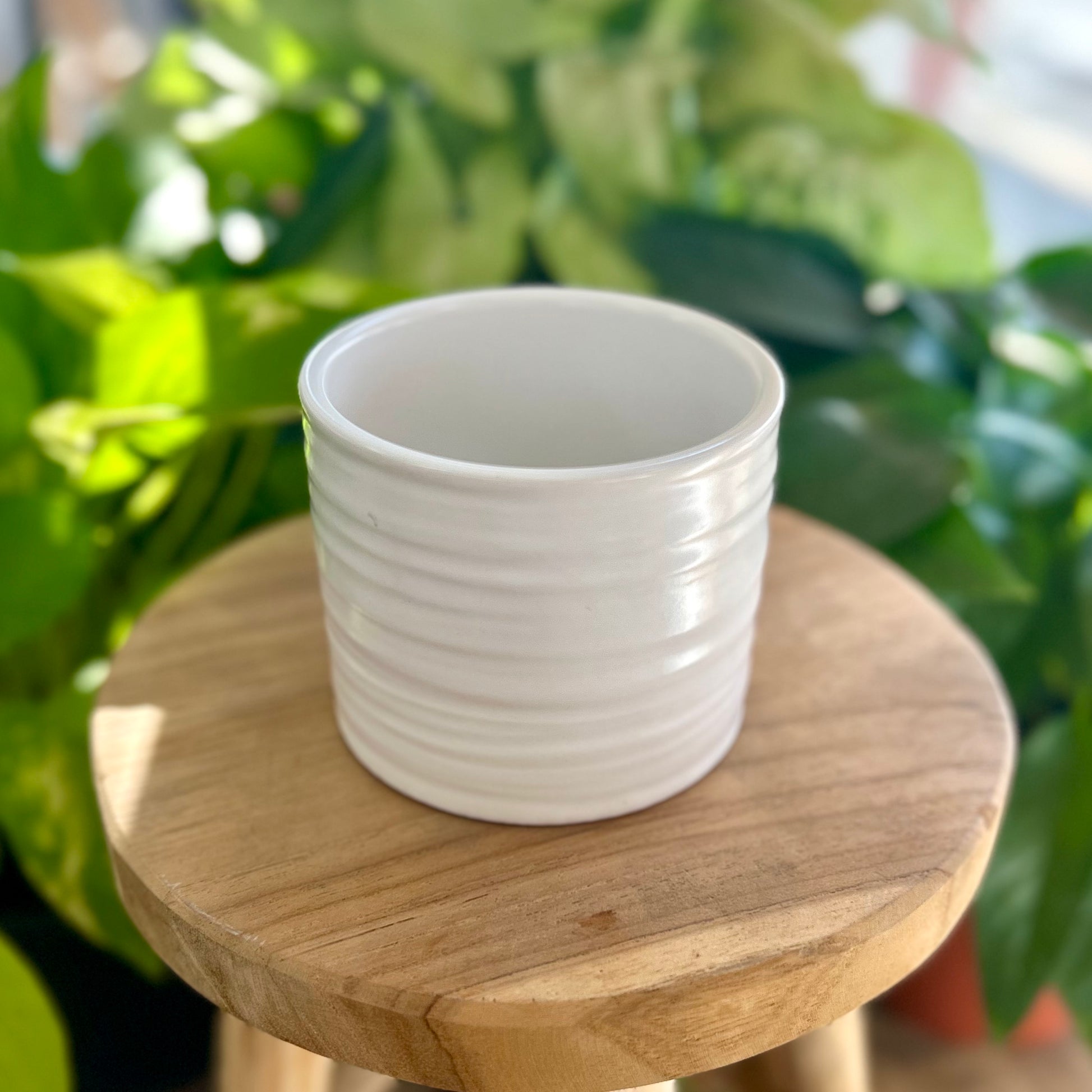 The Everest Pot is a white ceramic pot with ripples of snowy glaze encircling it. It's bright snowy white color is reminiscent of it's namesake.